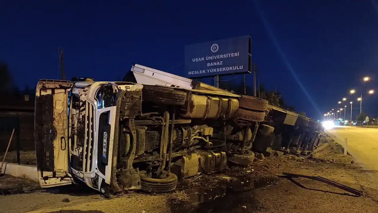Edinilen bilgilere göre, 34 MLU 924 plakalı tır, Banaz Meslek Yüksekokulu önünde seyir halindeyken sürücüsünün direksiyon hâkimiyetini kaybetmesi sonucu yol kenarına devrildi.