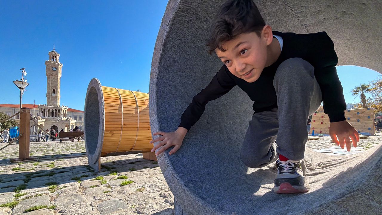 Konak Atatürk Meydanı'na konuşlandırılan tırda bir araya gelen çocuklar, geleneksel oyunlar oynadı.