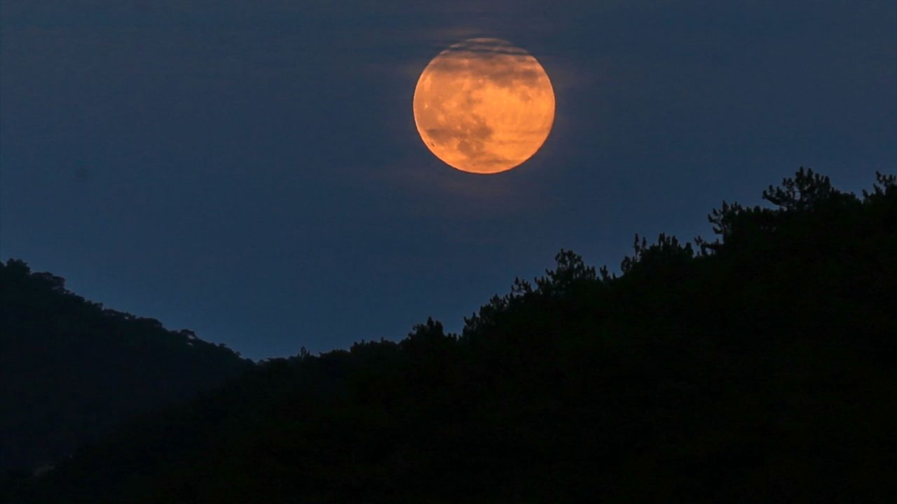 Manisa'da akşam saatlerinde beliren 'Kunduz Ayı' olarak da adlandırılan dolunay, Spil Dağı Milli Parkı yamaçlarında güzel görüntü oluşturdu.