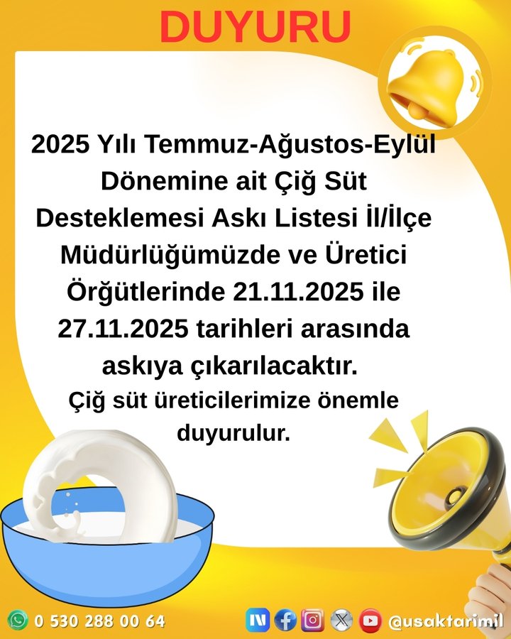 Müdürlük, olası hak kayıplarının önüne geçmek adına süt üreticilerinin askı listelerini kontrol etmeleri gerektiğini hatırlatarak, “Üreticilerimize önemle duyurulur” ifadelerini kullandı.