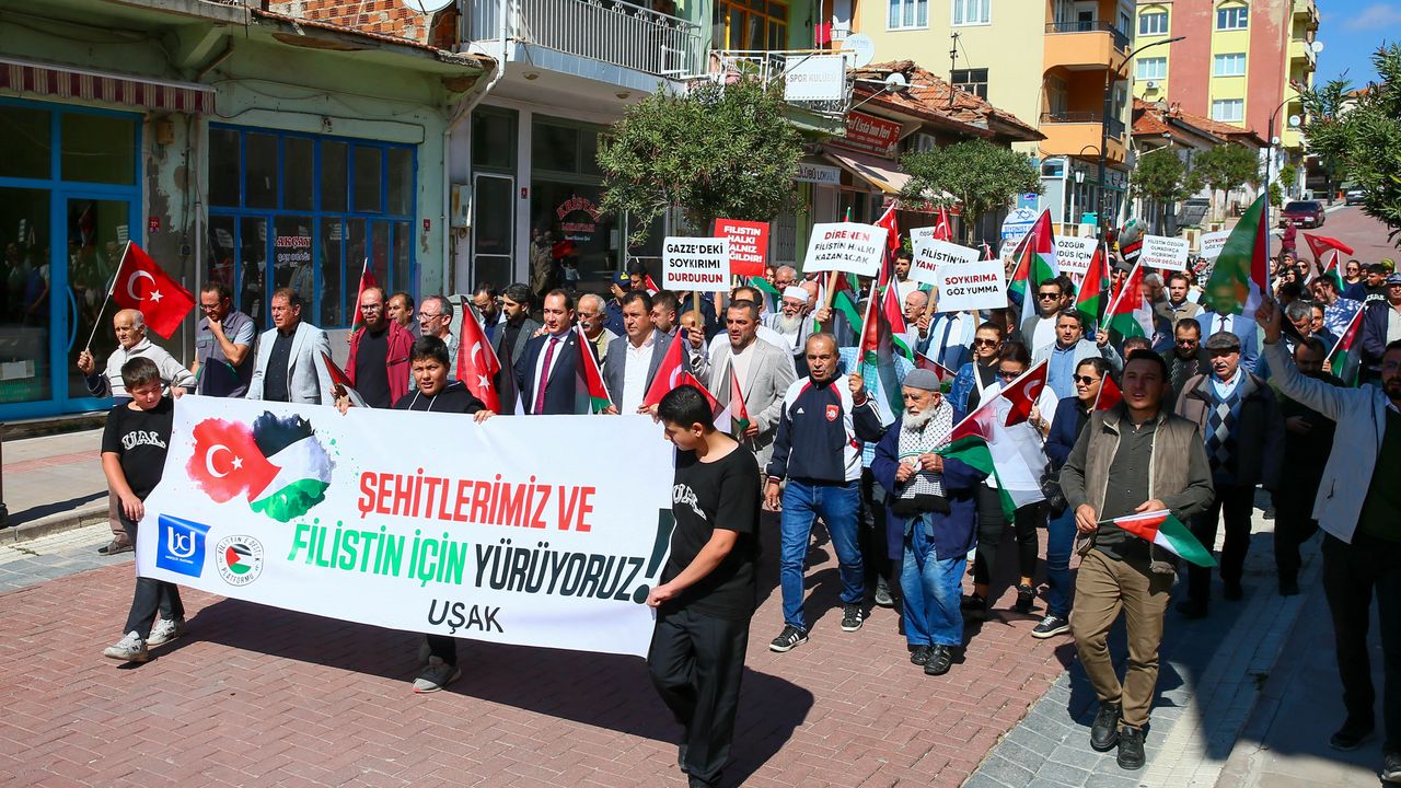 'Şehitlerimiz ve Filistin için yürüyoruz' yazılı pankartın açıldığı yürüyüşte, bazı vatandaşlar da 'Filistin halkı yalnız değildir', 'Direnen Filistin halkı kazanacak', 'Filistin halkı yalnız değildir' ve 'Soykırıma göz yumma' yazılı dövizler taşıdı.