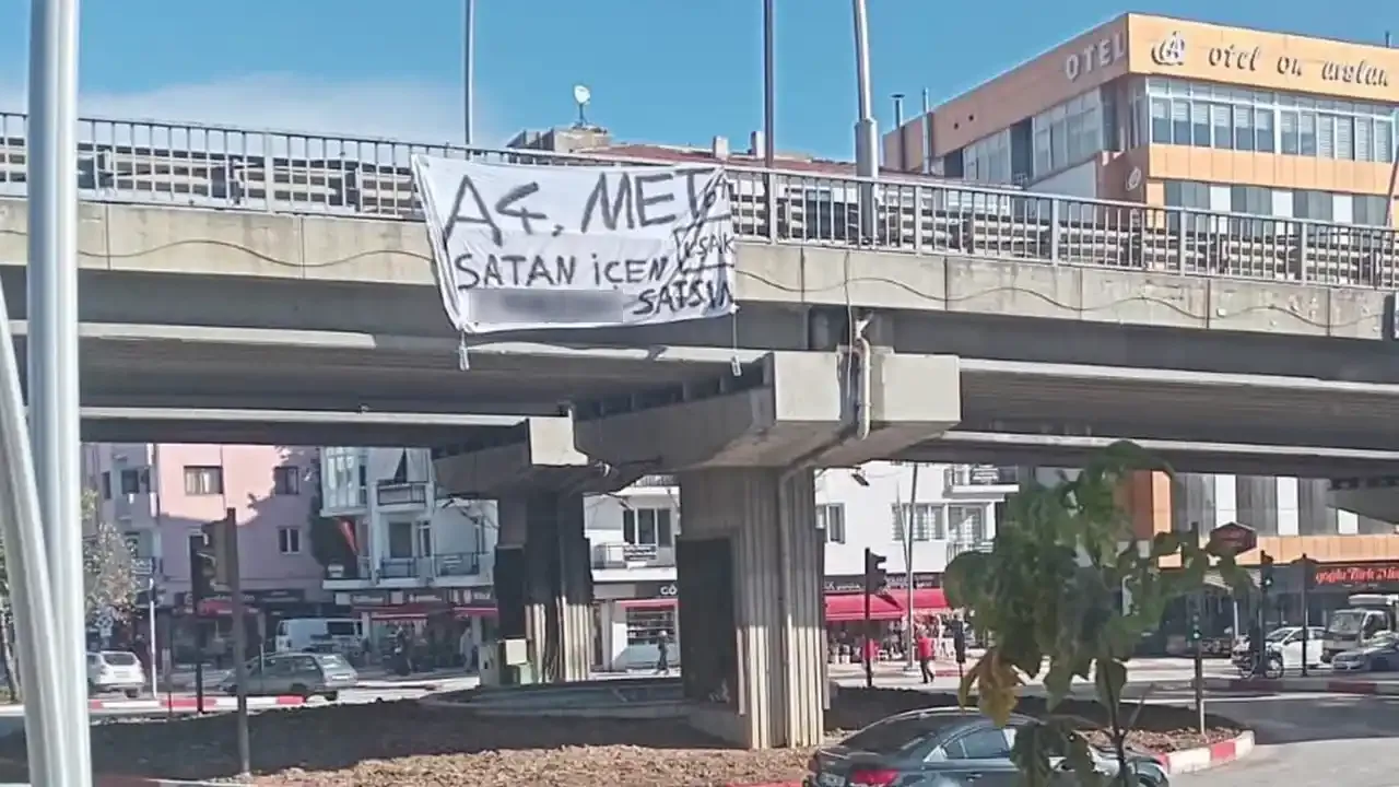 Kimliği henüz tespit edilemeyen kişi ya da kişiler tarafından asıldığı değerlendirilen pankartta, “A4 MET64 Satan-İçen A…… Satsın” ifadeleri yer aldı.
