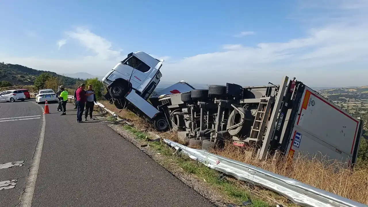 Uşak-İzmir Karayolu’nun Yenişehir rampası mevkiinde meydana gelen trafik kazasında, dorsesinde şişe yüklü bir tır şarampole devrildi.